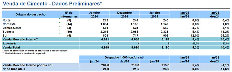 Por dia útil, que considera o número de dias trabalhados, a comercialização de cimento foi de 215,6 mil toneladas em janeiro, o que representa uma evolução de 5,4%, comparado ao mesmo mês do ano anterior, e queda de 1,1% em relação a dezembro de 2024.